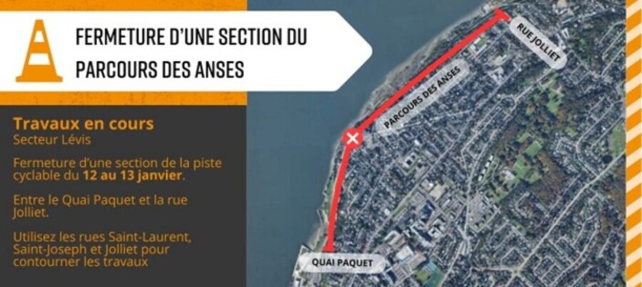 La Ville de Lévis informe la population qu’un tronçon de deux kilomètres du Parcours des Anses, situé entre la rue Jolliet et le Quai Paquet, sera fermé temporairement du 12 au 30 janvier 2026.