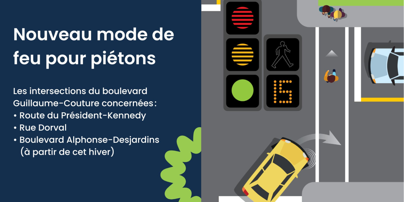 Comme c’est le cas pour les intersections de la route du Président-Kennedy et de la rue Dorval, les phases piétonnes concourantes aux voitures seront mises en fonction à l’intersection du boulevard Alphonse-Desjardins une fois les voies ouvertes pour la période hivernale, et ce, jusqu’à la reprise des chantiers au printemps.