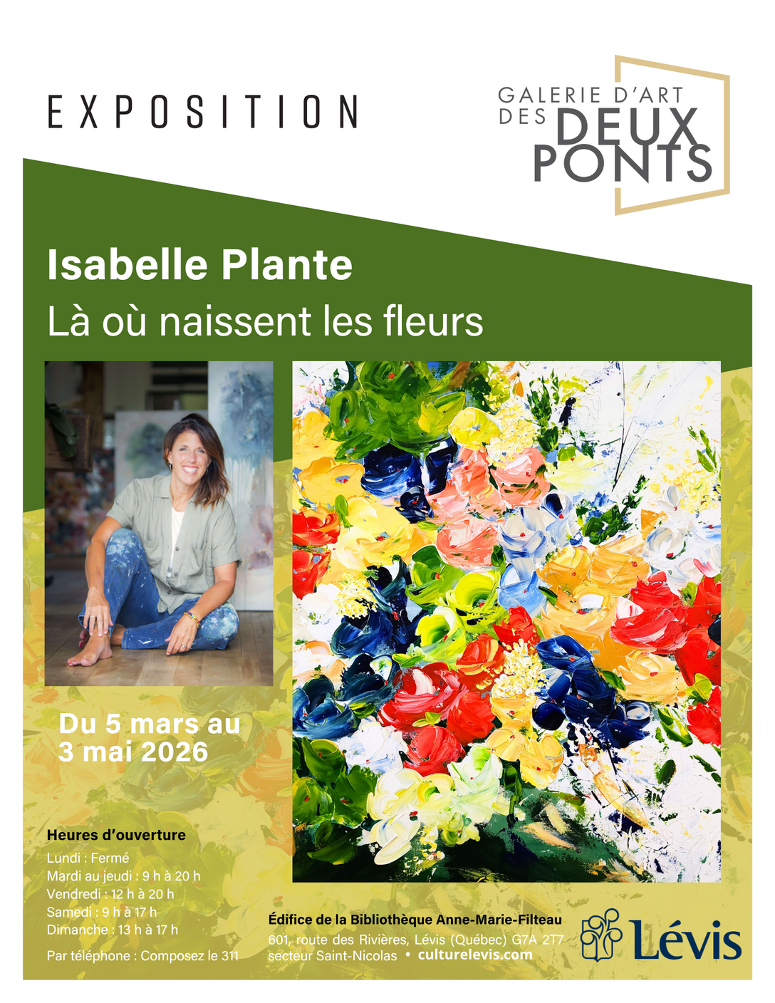 La Galerie d’art des Deux-Ponts est heureuse de présenter Là où naissent les fleurs, une nouvelle exposition de l’artiste Isabelle Plante, à découvrir du 5 mars au 3 mai 2026.