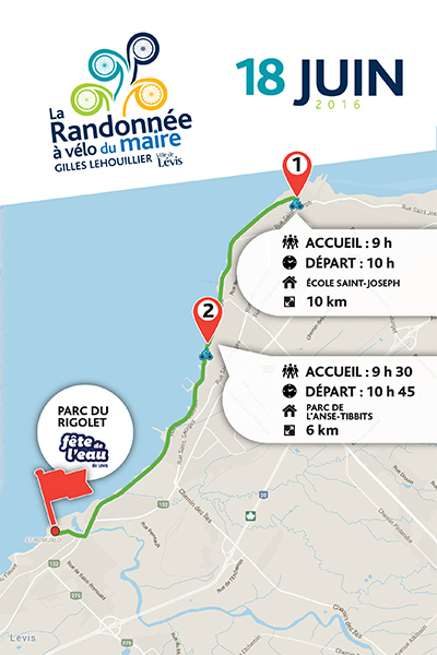 L’activité se déroulera sur le Parcours des Anses, en bordure du fleuve Saint-Laurent. Deux points de départ sont proposés. Le premier à 10 h à la piscine Mil Davie derrière l’église Saint-Joseph (secteur Lévis) et le second, plus loin sur le parcours, à 10 h 45, au parc de l’Anse-Tibbits (secteur Lévis). Selon le point de départ choisi, les trajets représentent respectivement 10 km et 6 km.