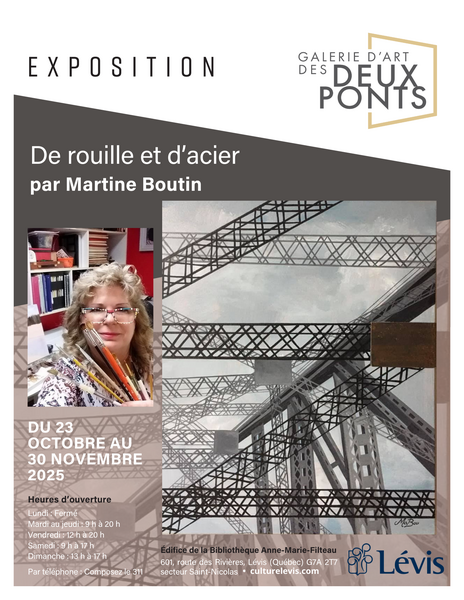 La Galerie d’art des Deux-Ponts est fière de présenter De rouille et d’acier, une exposition solo de l’artiste Martine Boutin, aussi connue sous le nom de MaBou, du 23 octobre au 20 novembre 2025. Formatrice en art visuel depuis plus de 15 ans, Martine Boutin propose une série d’œuvres inspirées par l’architecture majestueuse du pont de Québec.